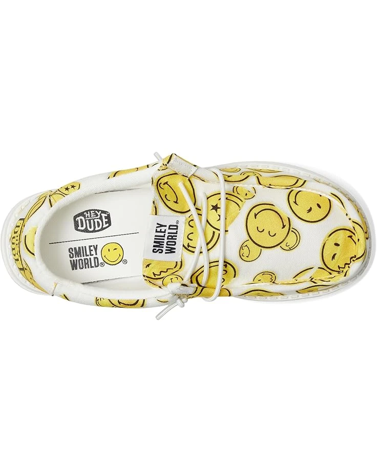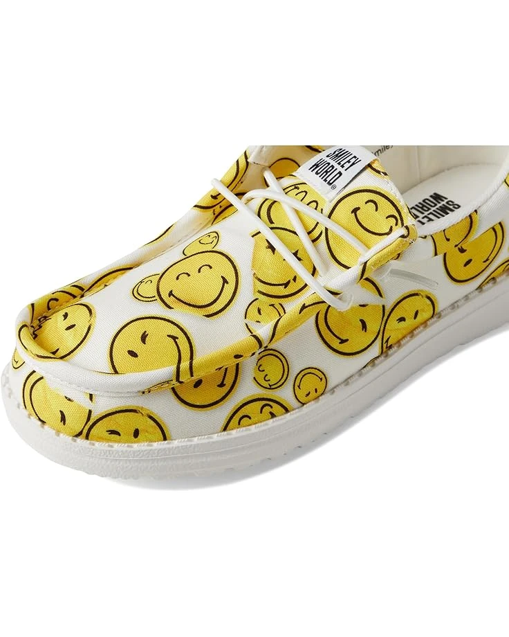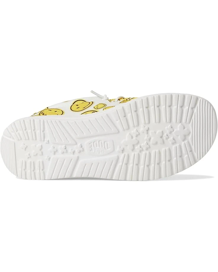 - Easy, breezy, textile makes this Hey Dude® Kids Wendy Smiley sneakers ready to roam. Crafted from printed canvas upper, cotton lining, and removable memory foam cushioned insole that provides maximum comfort and reduces sweating and odors. Flex & Fold technology: This supports healthy feet with its unique shape giving complete freedom of movement.
