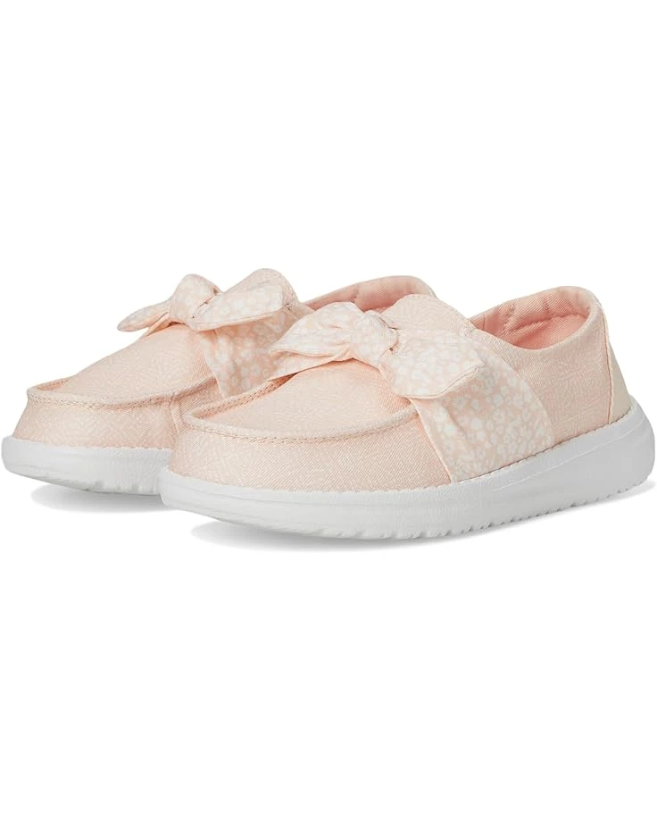 - Styled with a bow detail, the Hey Dude® Kids Wendy Bow Prints shoes are perfect to pair with your kid’s party looks and casual outfits. The canvas upper of these shoes features elastic laces that allow them to flex with the foot, resulting in a shoe that fits more uniformly. Their breathable cotton lining offers added comfort while the removable memory foam cushioned insole provides maximum comfort and reduces sweating and odors. The Flex & Fold design of these printed sneakers supports healthy feet with its unique shape giving complete freedom of movement.