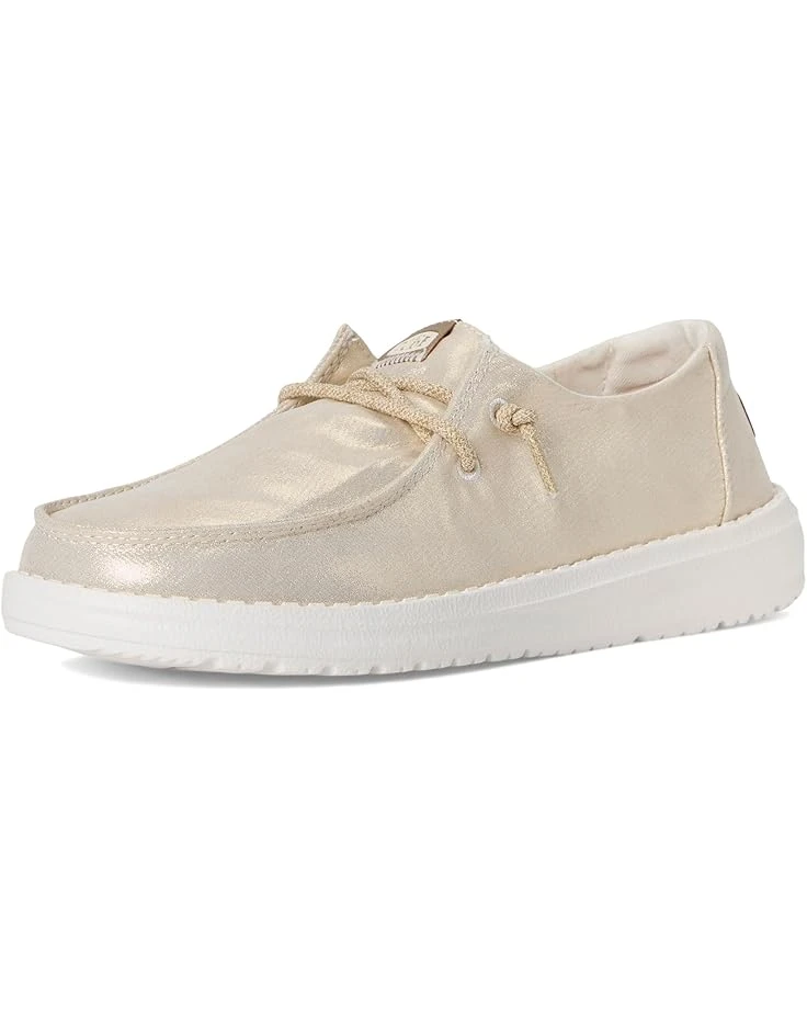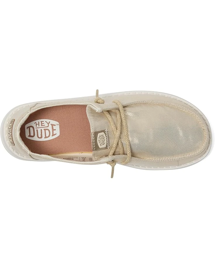 - Spruce up your casual attires by adding glam to them wearing the low-top Hey Dude® Kids Wendy Metallic Shine Loafers. The rounded toe design and flex & fold supports healthy feet with its unique shape giving complete freedom of movement. The lightweight construction with elastic lace detail allows them to flex with the foot, resulting in a shoe that fits more uniformly. The metallic canvas upper, cotton lining, and removable memory foam cushioned insole provides maximum comfort.