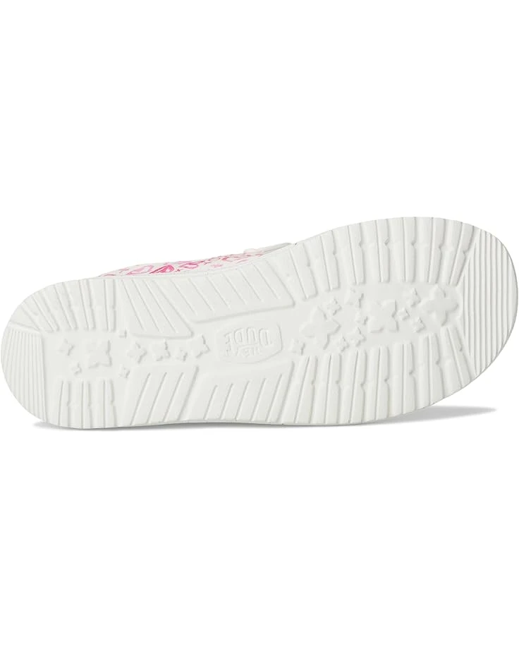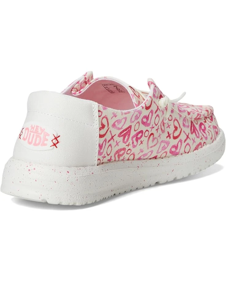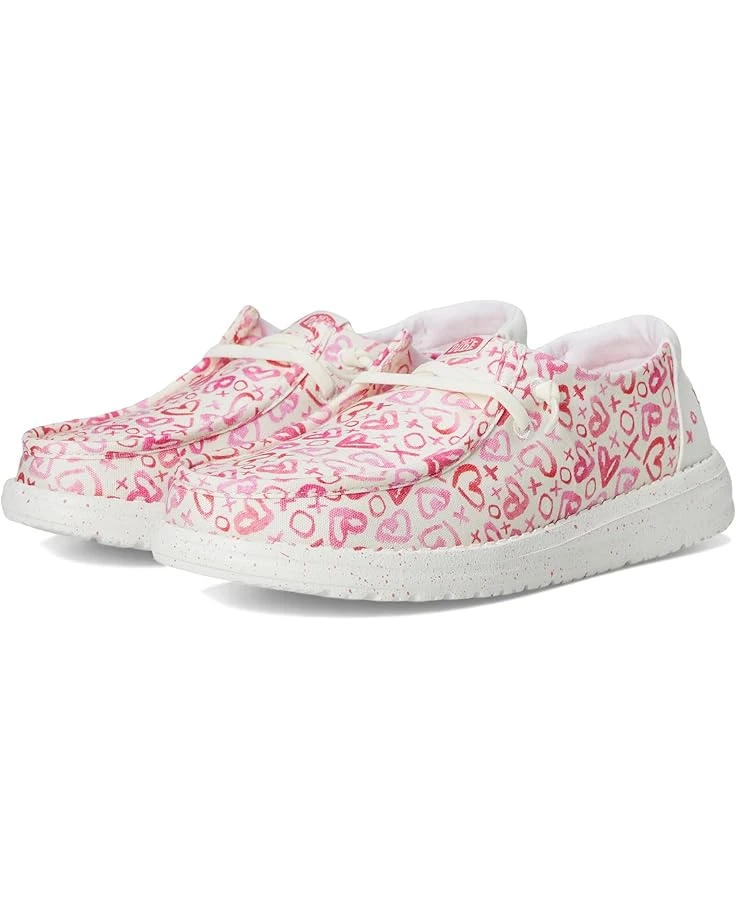- Featuring an allover heart print, the Hey Dude® Kids Wendy Watercolor Hearts are ready to roam. The canvas upper features elastic laces and a Flex & Fold design that supports healthy feet. These lace-up shoes are made of a cotton lining and removable memory foam cushioned insole that provides maximum comfort and reduces sweating and odors. These printed sneakers will be an instant favorite in your kid’s modern-casual shoe collection.