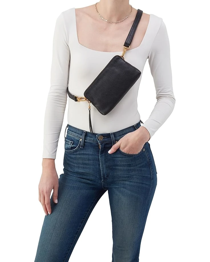 - Go hands-free and travel light with the HOBO™Fern Slim Belt Bag. Crafted from leather, this bag features zippered closure, removable and adjustable solid leather single strap, three interior credit card slots, and one interior zippered pocket.